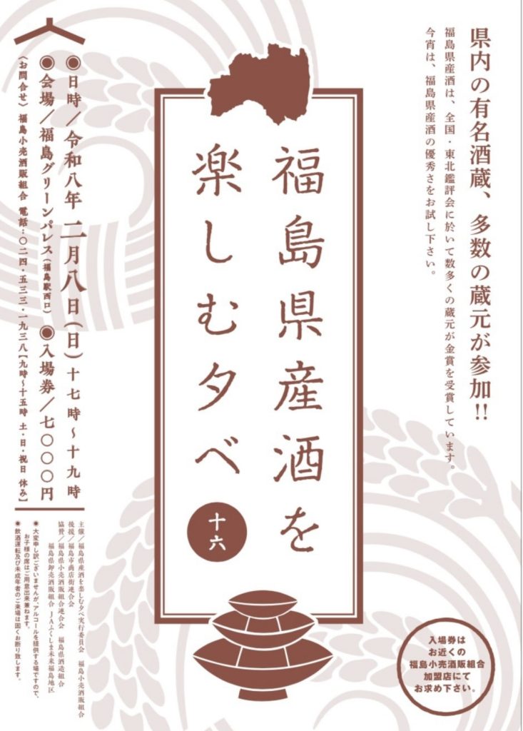2/8 福島県産酒を楽しむ夕べ 2026.01.29 ■日時:2月8日(日)17:00~19:00 ■会場:福島グリーンパレス(福島駅日口) ■入場券:¥7,000 (入場券はお近くの福島小売酒販組合加盟店にてお求めください。) ■主催:福島県産酒を楽しむ夕べ実行委員会、福島小売酒販組合