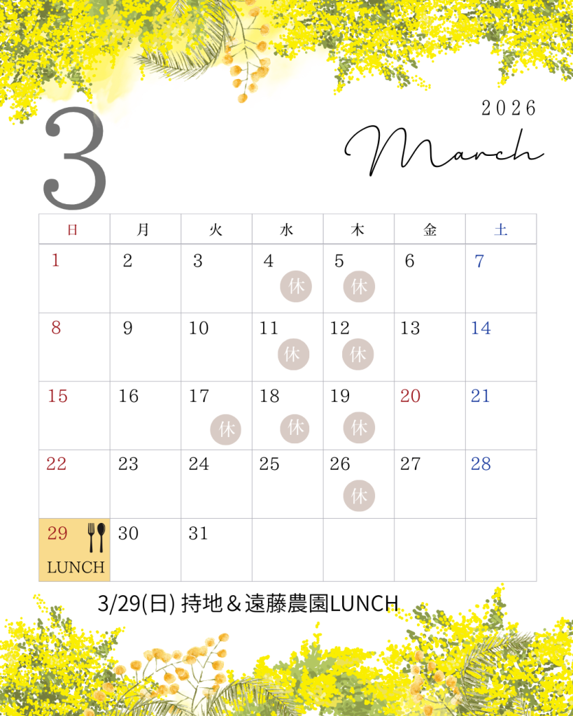 さて、2026年3月のセラードア(ワイナリー試飲販売所)の営業日は、
