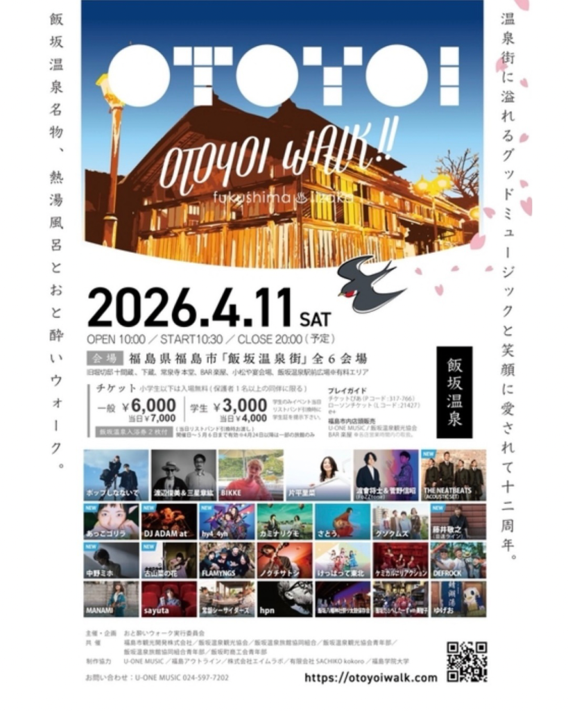 4/11 おと酔いウォーク 2026.03.31 開催日:4/11(土) 開催時間: OPEN 10:00 / START 10:30 / CLOSE 20:00 (予定) チケット料金 前売:一般¥6,000/学生¥3,000 チケット料金 当日:一般¥7,000/学生¥4,000 会場 福島県福島市飯坂町「飯坂温泉街」全6会場