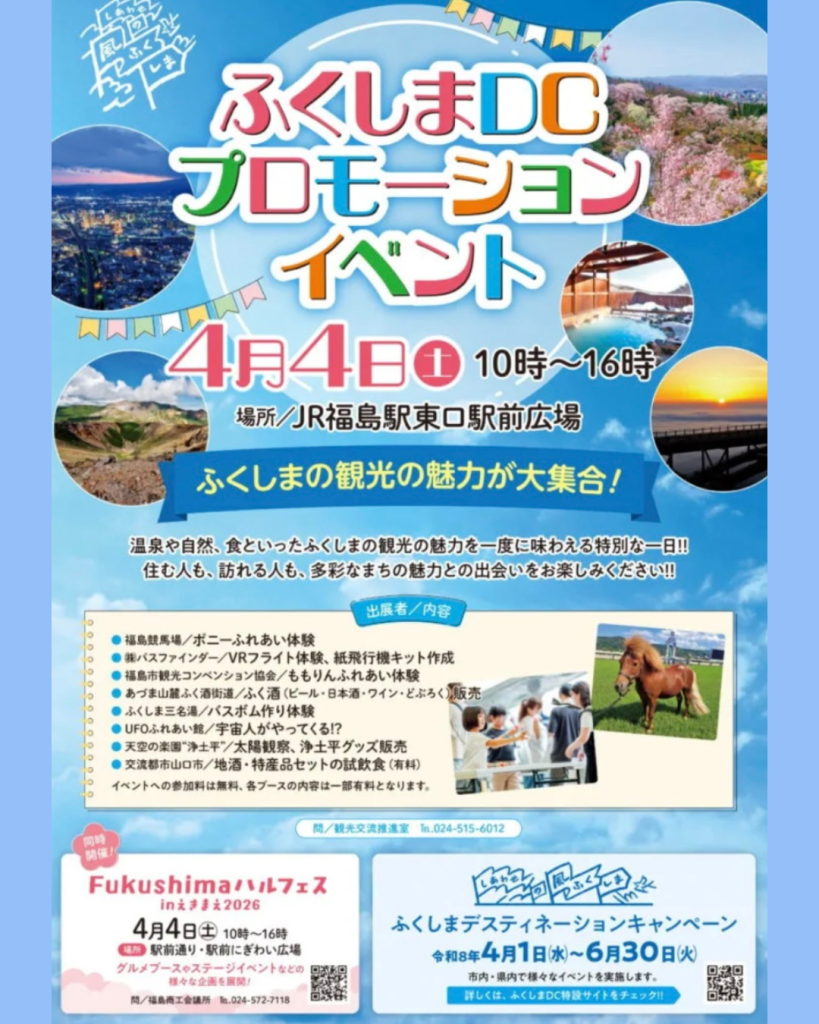 駐車場:なし(お近くの有料駐車場をご利用ください)HP・SNS: ふくしまDC特設サイト問合せ:福島市観光交流推進室 TEL:024-515-6012